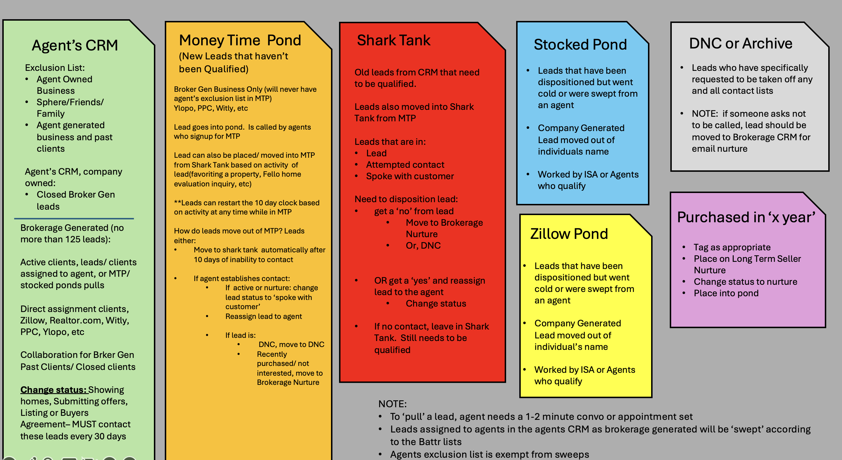 - These are leads that are company generated and at one point were likely in an agents name. These leads have been dispositioned (we know what they want, timeframe, etc). They were likely swept from an agent, OR an agent lost touch with them.