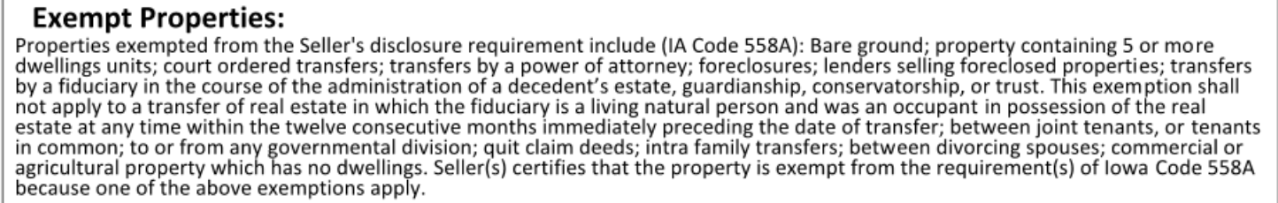 - Exempt properties: Exempt properties are just that- they are exempt from having to disclose issues about the property. This is mostly in cases where the representative of the property being sold, likely doesn't know full and complete, or any info about a property.